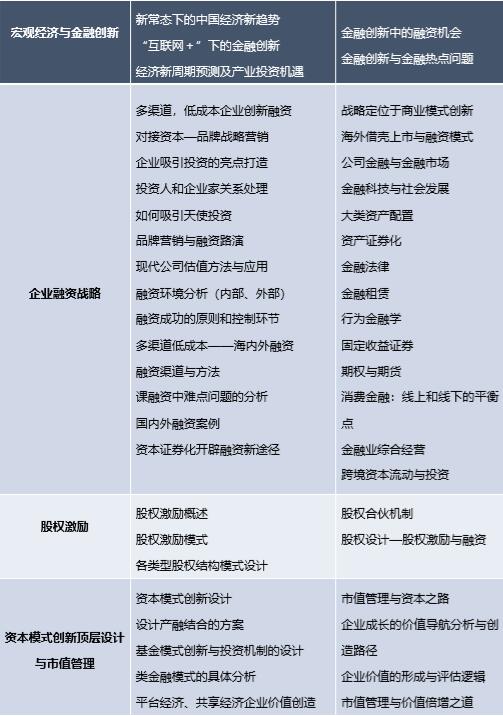 新環境下企業如何選擇自己的方向,定位戰略目標?如何利用資本市場實現公司的持續發展和快速增值?“金融戰略與融資創新實戰班”課程立足于幫助學員了解資本市場大環境,明確自身企業的資本戰略,掌握與資本市場對接的操作流程,并清晰把握資本運作過程中的財務和法律風險,儲備資本運營知識,以幫助企業通過資本市場實現快速增值。