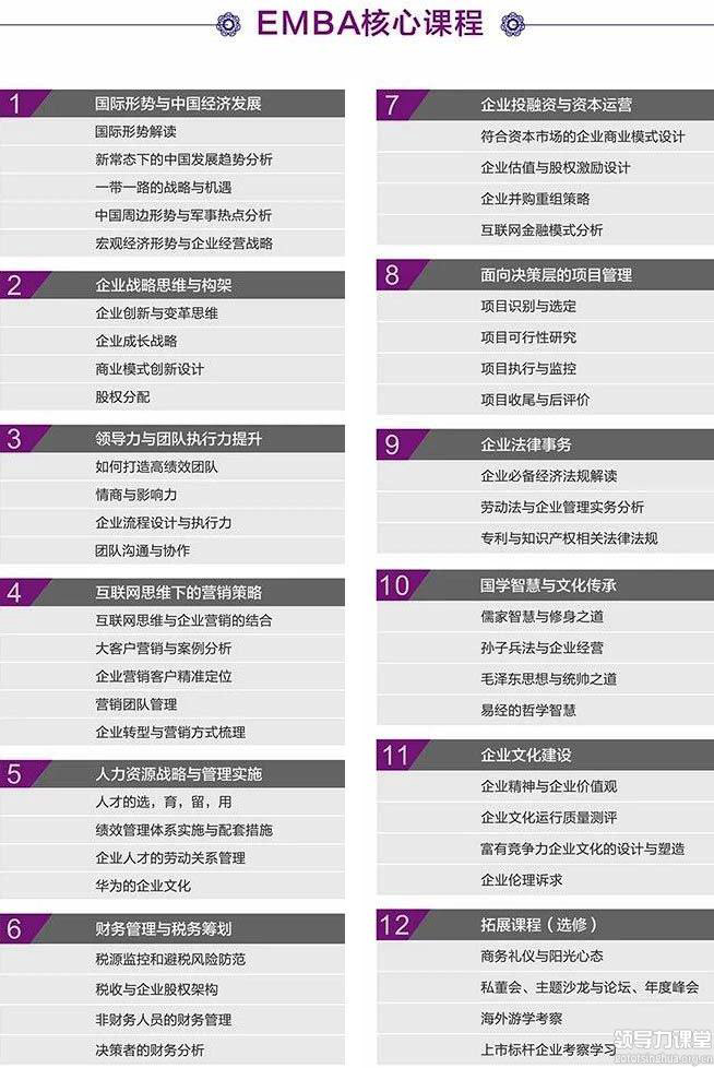清華EMBA借助近百年清華綜合類大學優點,集十余年辦校工作經驗,對于公司領導者發布“天、地、人、通”全新升級課程設置。“天”控制模塊分析公司宏觀經濟運營自然環境,“地”控制模塊營造企業運營管理方法之道,“人”控制模塊提高管理人員領導能力及素質,“通”控制模塊助推管理者做到“古、今、中、西、文、理、商、工”八方還通之人生境界。課程內容與眾不同、高手匯集,稱得上全球一流、社會主義民主、清華設計風格。清華EMBA文化教育期待帶來公司和公司管理者的新格局是:了解“天和”有高寬比;掌握“地利人和”有深度;造就“人與”有溫度;“還通”八方有深度廣度。