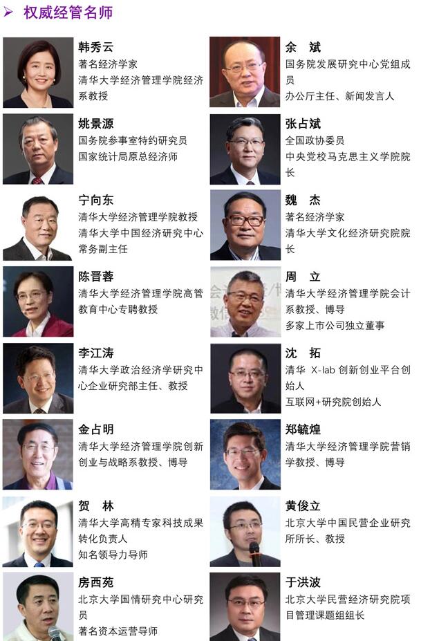 項目創立至今已有十五載,三次升級三次迭代,歷經清大工商EMBA1.0-6.0,陪伴和成就10000+企業家、高級管理者的成長、成熟與成功。15年的成功辦學經驗以及對中國企業家群體不斷升級的學習需求的深度調研、深刻理解,全新定義總裁EMBA終身學習:獨家研創 “道、天、地、將、法” 全新清大工商EMBA7.0課程體系。“道”模塊解決做久之道,“天”模塊解決做對之道,“地”模塊解決做大之道,“將”模塊解決做強之道,“法”模塊解決做成之道。